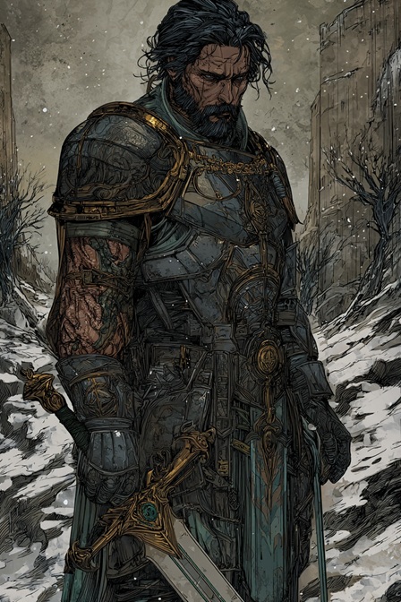 También porta la armadura de un rey muerto, de metal oscuro con damasquinados en ocre y plata vieja, una fina tiara de oro retorcido y un mandoble de hoja ancha y verdosa, casi de aspecto de jade envejecido. No es la estampa de un caballero pulcro, sino la de un monarca maldito o un campeón arrancado de un sepulcro. De ahí que su sola presencia provoque reverencia, miedo o expectativa religiosa.